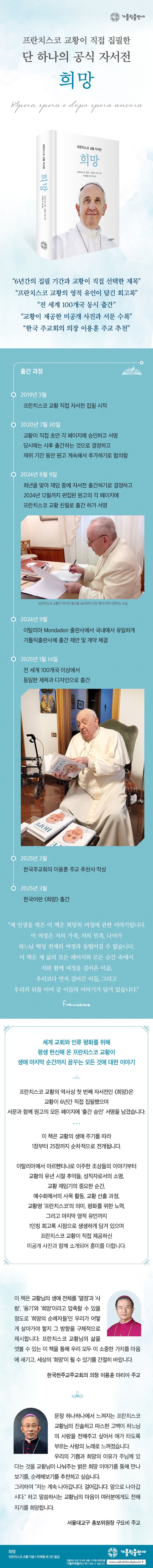 전 세계가 팬데믹, 기후 위기, 전쟁과 불평등으로 고통받고 있는 지금, 우리에게 가장 필요한 것은 무엇일까요? 프란치스코 교황은 그 해답을 『교황의 희망』이라는 책을 통해 아주 조용하지만 강하게 전하고 있습니다. 『교황의 희망』은 단순한 교훈이나 훈계가 아닙니다. 오히려 가장 낮은 곳에서 시작하는 대화이자 연대와 회복을 향한 여정입니다. 교황은 자신의 경험을 진솔하게 털어놓으며, 인류가 함께 겪고 있는 위기를 더 나은 미래로 가는 기회로 삼자고 말합니다. 이 책은 종교를 초월해 인간으로서 우리가 어떻게 살아야 할지를 묻습니다. 그래서 더 많은 사람들이 이 책을 ‘희망의 안내서’로 받아들이고 있습니다.