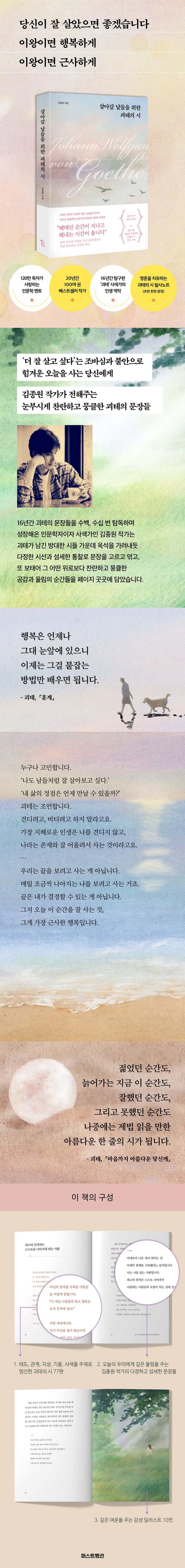 『살아갈 날들을 위한 괴테의 시』는 괴테의 시를 단지 문학작품으로 읽지 않고, 삶의 질문에 대한 하나의 답으로 풀어낸 책입니다. 그의 시는 고요하지만 단단하게 말합니다. “모든 것은 지나간다. 지나간다는 것은 곧 지나갈 수 있다는 뜻이다.” 짧은 시 한 편에도 치유의 숨결이 담겨 있고, 지금을 버티는 누군가의 마음에 깊은 숨 같은 쉼이 되어줍니다. 하루 한 편, 감정에 따라 골라 읽는 즐거움도 이 책의 묘미입니다.