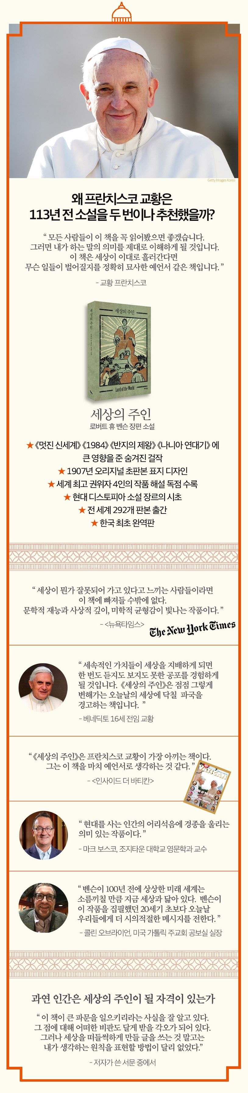 네, 교황 프란치스코는 『세상의 주인』을 가장 인상 깊은 책 중 하나로 소개하며, 현대인들에게 꼭 읽어야 할 책이라 권했습니다.