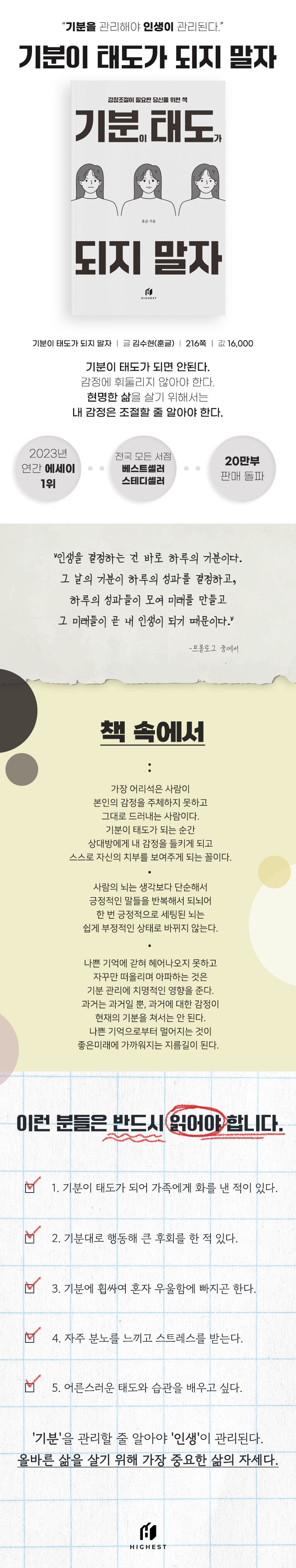 『기분이 태도가 되지 말자』는 단순한 자기계발서가 아닙니다. 감정을 조절하고 관계를 돌보는 구체적인 지침서입니다. 내 기분 하나가 누군가의 하루를 망칠 수도 있고, 또 다르게는 누군가를 살릴 수도 있습니다. 이 책은 바로 그 감정의 힘을 정확히 바라보고 현명하게 다루는 연습을 시작하게 해줍니다. 바쁜 일상 속, 자기 감정 하나조차 돌아볼 여유가 없는 분들이라면 꼭 한 번 읽어보길 추천드립니다. 스스로를 더 이해하고, 주변 사람들과 더 건강한 관계를 맺고 싶다면 지금 이 책이 필요한 시점입니다.