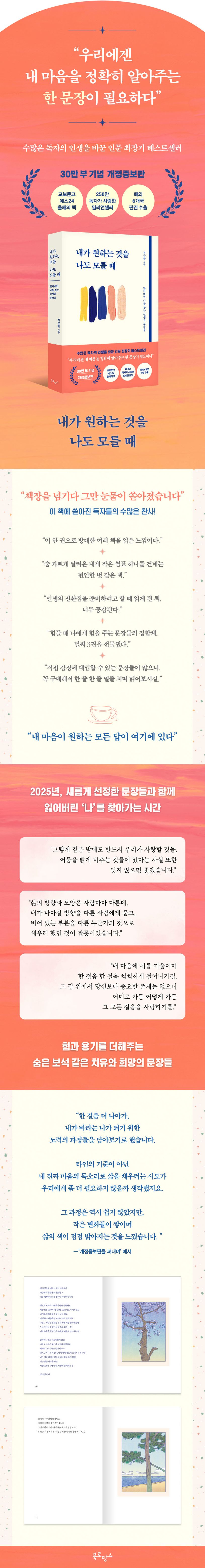 『내가 원하는 것을 나도 모를 때』는 자기 자신과의 대화가 필요한 모든 이들을 위한 책입니다. 화려하지 않지만 섬세하고, 감정 깊은 곳까지 스며드는 글들은 누군가의 위로보다 더 큰 울림이 되어줄 수 있습니다. 복잡한 하루를 살아가는 당신에게, 이 책 한 권이 마음의 여백이 되어주길 바랍니다.