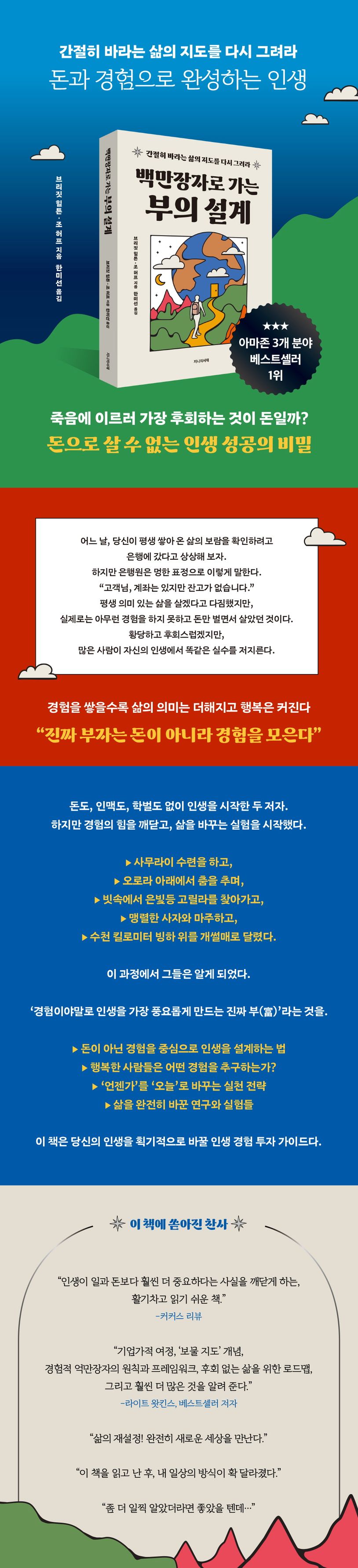 우리가 부를 떠올릴 때 흔히 생각하는 것은 ‘수치’입니다. 하지만 이 책은 질문을 바꿉니다. “당신은 언제 가장 살아있다고 느끼나요?” 그 질문에 대한 답이 곧, 당신이 추구해야 할 부입니다. 물질적 성취뿐 아니라 가치 있는 경험, 관계, 배움이 우리의 인생을 진짜 부자로 만들어준다고 강조합니다.
