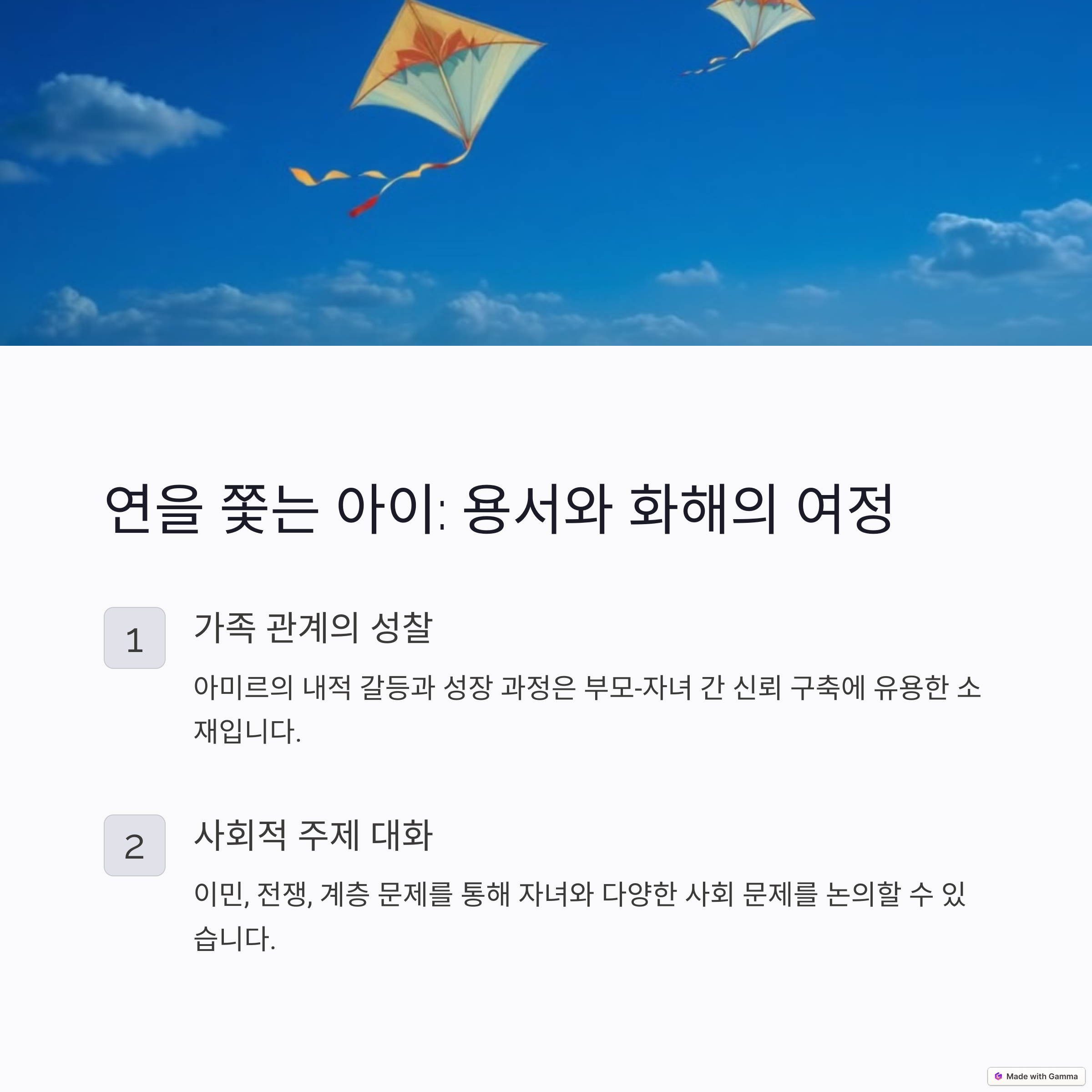 할레드 호세이니의 『연을 쫓는 아이』는 아프가니스탄의 역사적 배경 속에서 펼쳐지는 감동적인 가족 이야기로, 친구와의 우정, 배신, 용서라는 무거운 주제를 다룹니다. 부모가 이 책을 먼저 읽는다면 자녀와의 관계 속에서도 용서와 화해의 중요성을 깨닫게 됩니다. 또한 이 책은 이민, 전쟁, 사회적 계층 문제를 다루며, 부모가 자녀와 함께 다양한 사회적 문제를 대화의 주제로 삼을 수 있도록 도와줍니다. 『연을 쫓는 아이』 속 주인공 아미르가 겪는 내적 갈등과 성장 과정은 부모가 자녀와 대화를 나누며 신뢰와 이해를 쌓는 데 유용한 소재가 됩니다. 특히, 용서와 화해의 메시지는 가족 간 갈등이나 사춘기 자녀와의 다툼을 보다 성숙하게 풀어가는 데 실질적인 도움을 줄 수 있습니다.