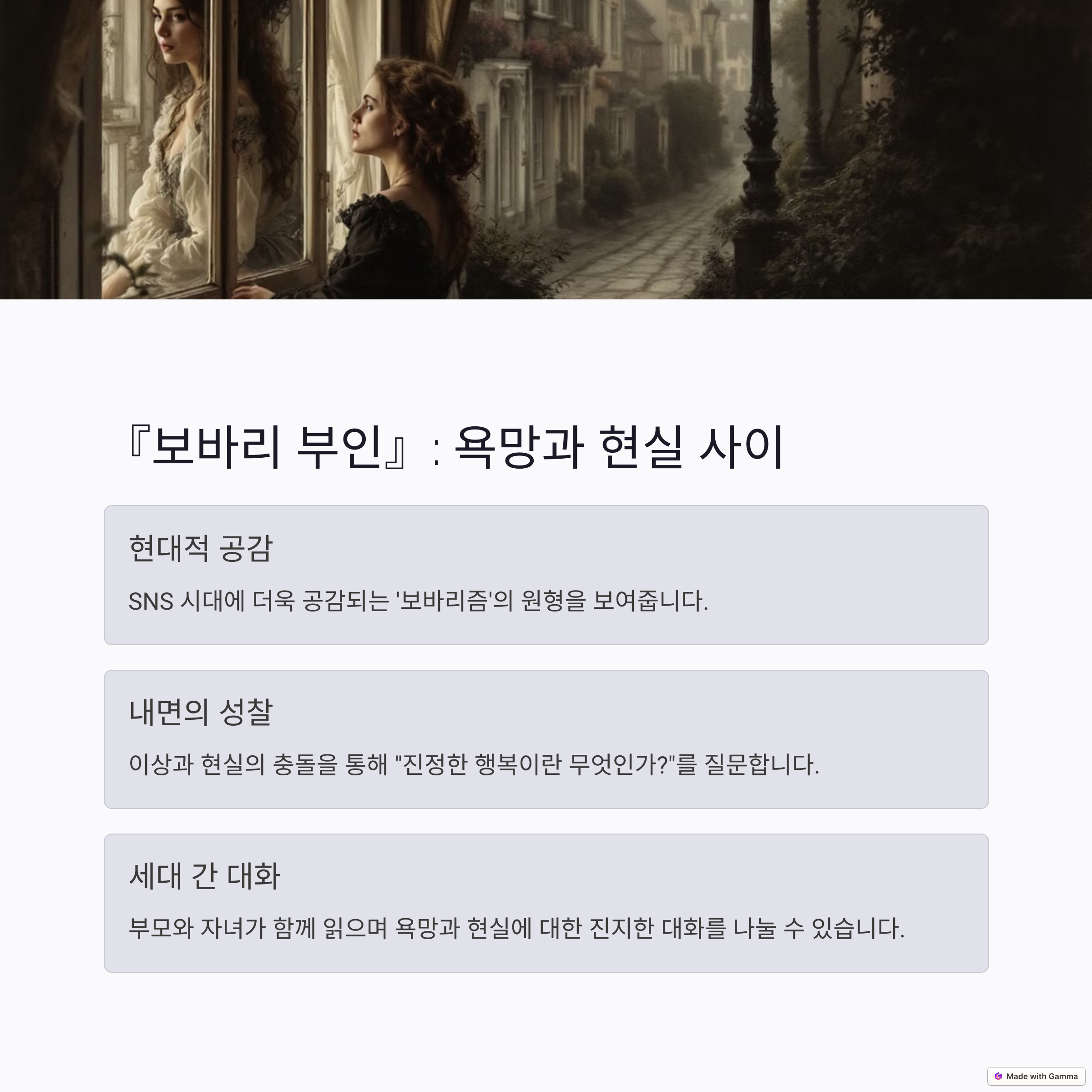 귀스타브 플로베르의 『보바리 부인』은 프랑스 사실주의 문학의 대표작으로, 환상에 젖어 현실을 도피하는 에마 보바리의 이야기를 통해 인간의 욕망과 좌절을 적나라하게 보여줍니다. 특히 SNS, 미디어가 발달한 오늘날, ‘보바리즘’이라는 용어가 생길 만큼 현대 사회에서도 여전히 적용되는 주제입니다. 이 작품은 인간 내면의 욕망, 이상과 현실의 충돌을 탁월하게 묘사하여 청소년 자녀뿐만 아니라 부모 세대에게도 깊은 성찰을 제공합니다. 『보바리 부인』을 읽다 보면 “현실을 어떻게 수용할 것인가?”, “진정한 행복이란 무엇인가?”라는 질문을 떠올리게 됩니다. 이 작품을 부모와 자녀가 함께 읽으며, 자기 자신과의 타협, 욕망을 어떻게 다스릴 것인지에 대한 진지한 대화를 나눌 수 있습니다. 자녀가 현실을 올바르게 바라보고, 자신만의 삶의 태도를 형성하는 데에도 큰 도움이 됩니다.