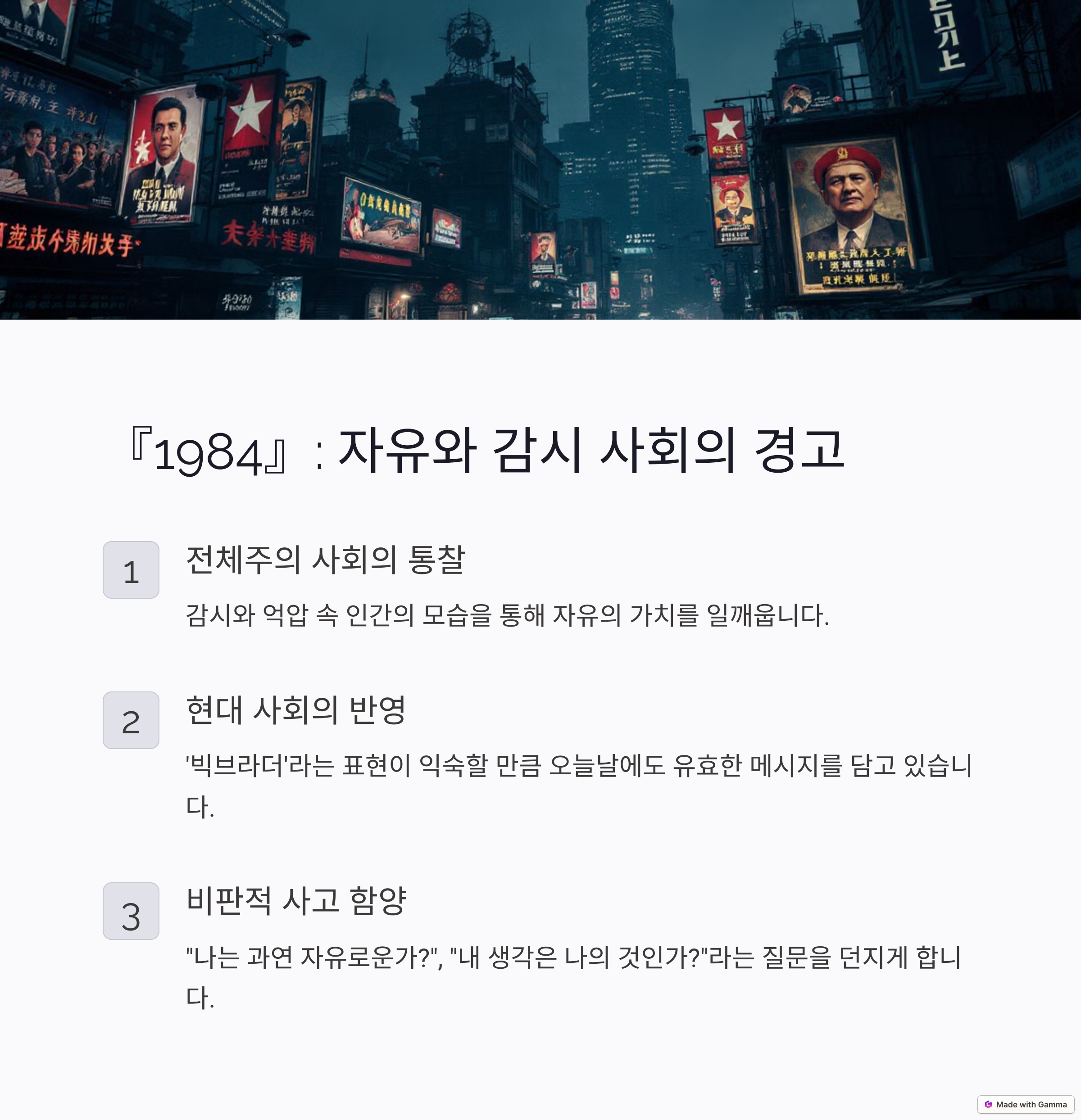 조지 오웰의 『1984』는 오늘날에도 꾸준히 회자되는 디스토피아 소설의 대표작입니다. 전체주의 사회 속에서 감시와 억압으로 살아가는 인간의 모습을 통해, 독자들은 자유의 가치와 비판적 사고의 중요성을 절감하게 됩니다. 2024년 현재에도 ‘빅브라더’라는 표현이 익숙할 만큼 『1984』가 던지는 메시지는 여전히 유효합니다. 정보의 과잉과 감시 사회의 현실이 더욱 피부로 다가오는 요즘, 『1984』는 사회 시스템을 넘어 개인의 선택과 윤리의식을 돌아보게 만듭니다. 이 책을 읽고 나면 독자는 “나는 과연 자유로운가?”, “내 생각은 나의 것인가?”라는 근본적인 질문을 던지게 됩니다. 특히 부모와 자녀가 함께 읽으면, 사회 구조와 개인의 권리에 대해 토론하며, 자녀의 비판적 사고력도 함께 키울 수 있습니다.