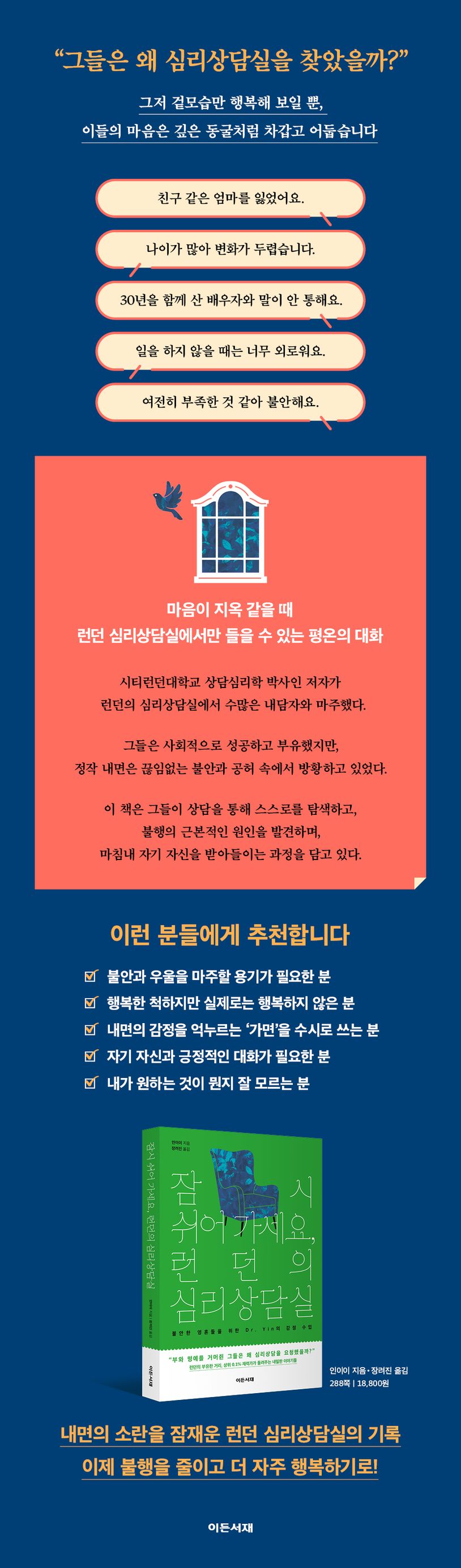 바쁘고 치열한 하루 속, 마음 한 구석에 쌓여가는 불안과 외로움. 『잠시 쉬어 가세요, 런던의 심리상담실』은 그런 감정들을 조용히 들여다보고 나 자신을 있는 그대로 이해하고 받아들이는 법을 알려주는 따뜻한 감정 수업입니다. 런던의 상담실에서 실제로 만난 내담자들의 이야기, 그리고 심리학 박사 Dr. Yin의 따뜻하고 실용적인 조언이 책 한 권 속에 담겨 있습니다. 감정을 억누르지 않고, 억지 긍정이 아닌 진짜 회복의 힘을 느끼고 싶은 분들께 이 책은 꼭 권하고 싶은 감정 치유서입니다.