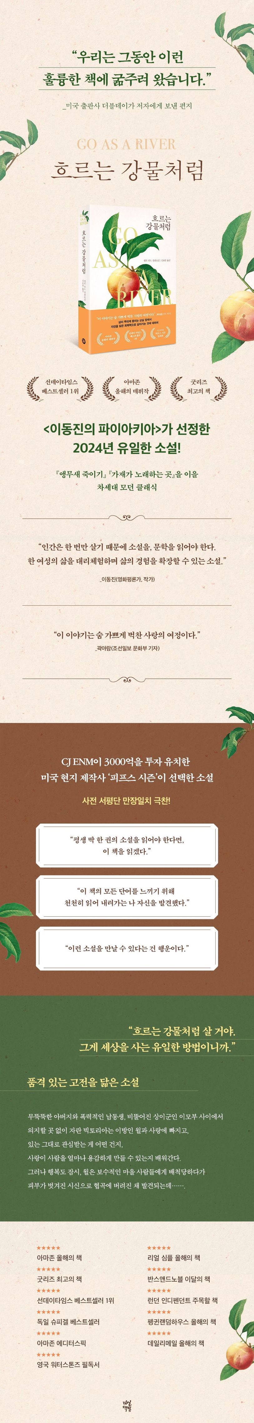 | 시대적 배경 속 사회적 차별과 편견을 다룹니다. | 강물은 삶의 흐름과 회복을 상징합니다. | 전 세계 30여 개국에 번역 출간된 화제작입니다. |