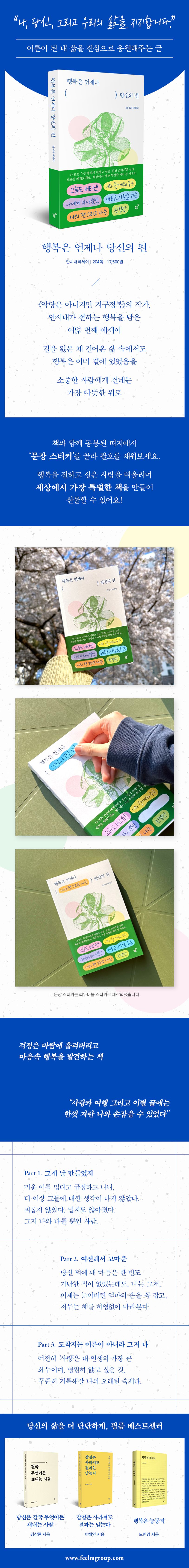 ‘행복은 언제나 당신의 편’은 단지 책을 넘기는 행위가 아니라 나와 마주하는 시간입니다. 반복되는 일상 속에서 내가 나를 잃어가고 있다면, 이 책은 나를 다시 나로 돌아오게 도와줄 것입니다. 평범한 오늘 속의 특별한 의미를 발견하게 만드는 따뜻한 안내서입니다.